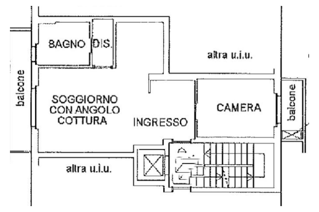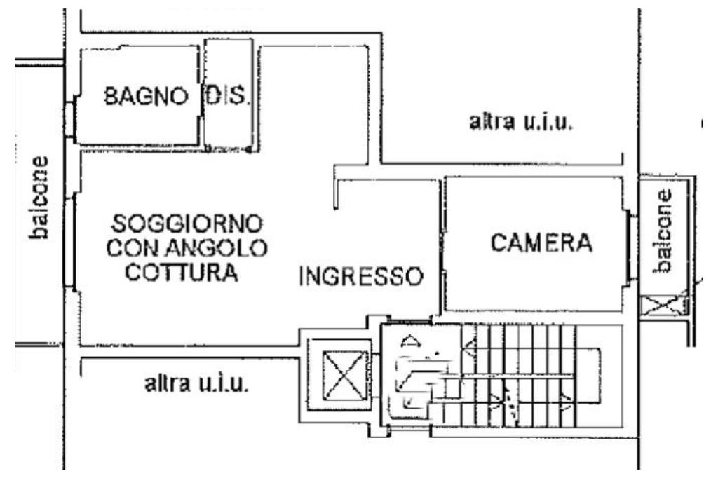 L'ingresso è nella zona giorno divisa in angolo cottura e soggiorno. Tramite disimpegno si giunge nella zona notte ove si trova la camera da letto e il bagno finestrato.