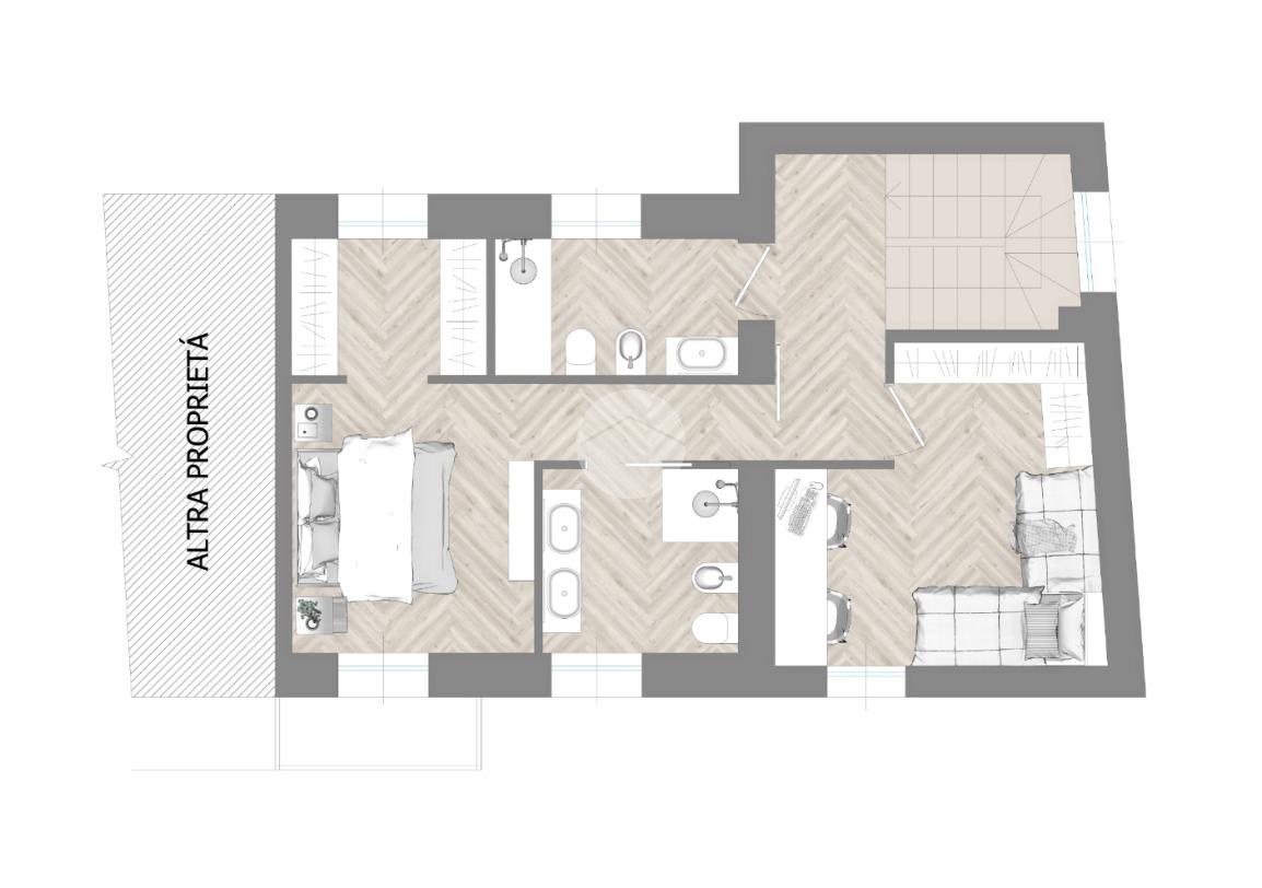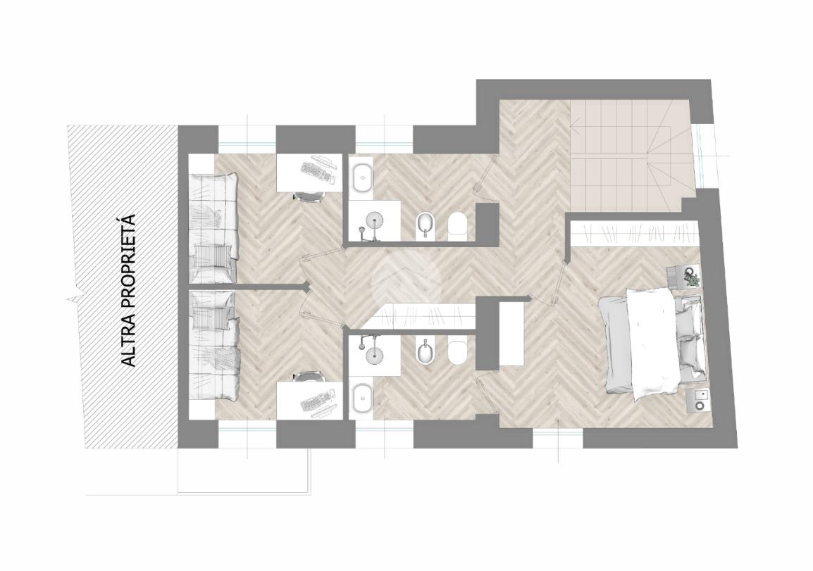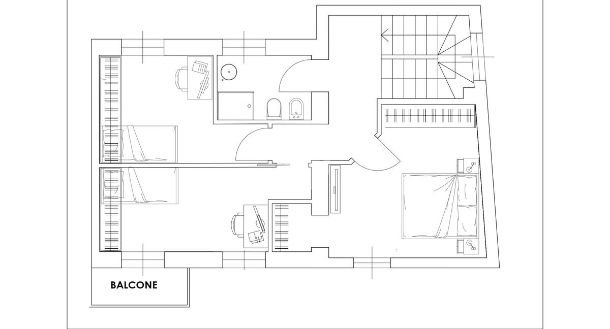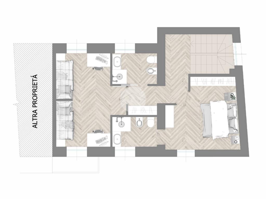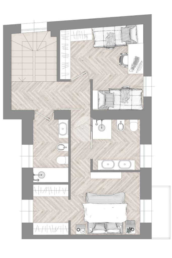 Tramite scala interna si accede al piano primo e si giunge nella zona notte. C’è la possibilità di suddividere i locali in diverse varianti. Esempio due camere grandi, di cui una con cabina armadio e doppio servizio oppure una camera da letto, due camerette e doppio servizio.
