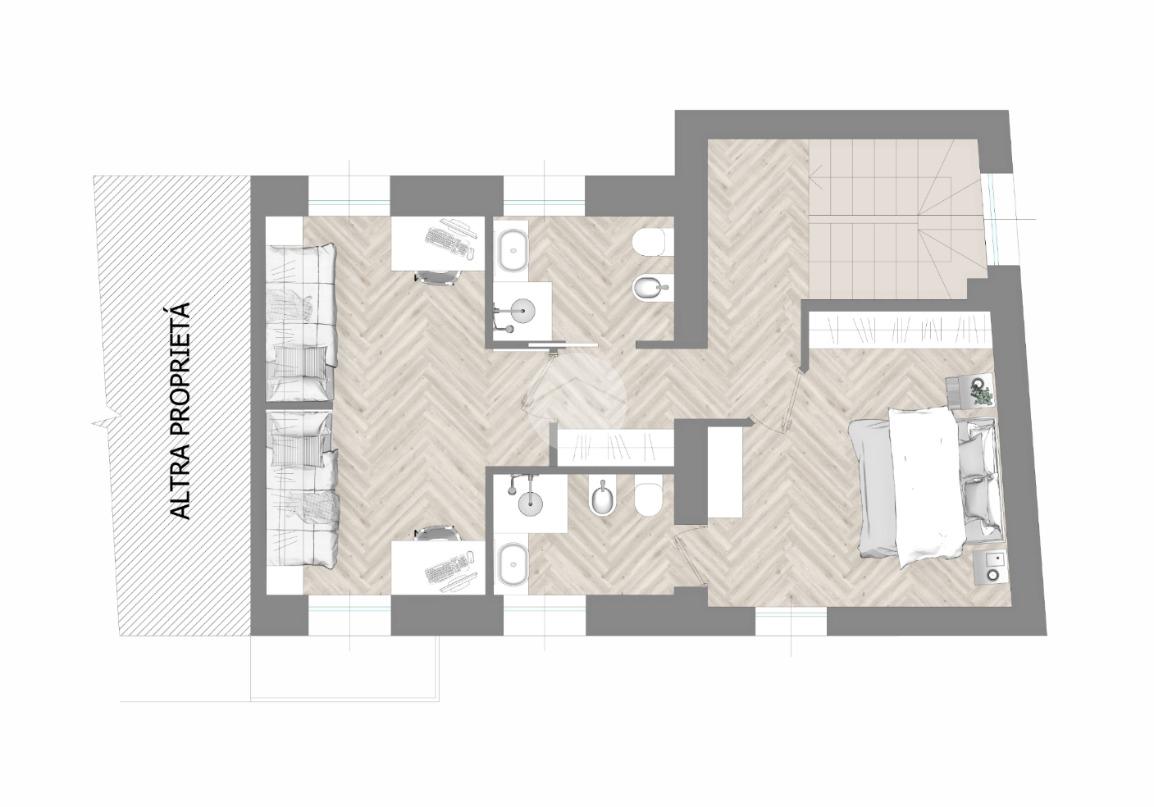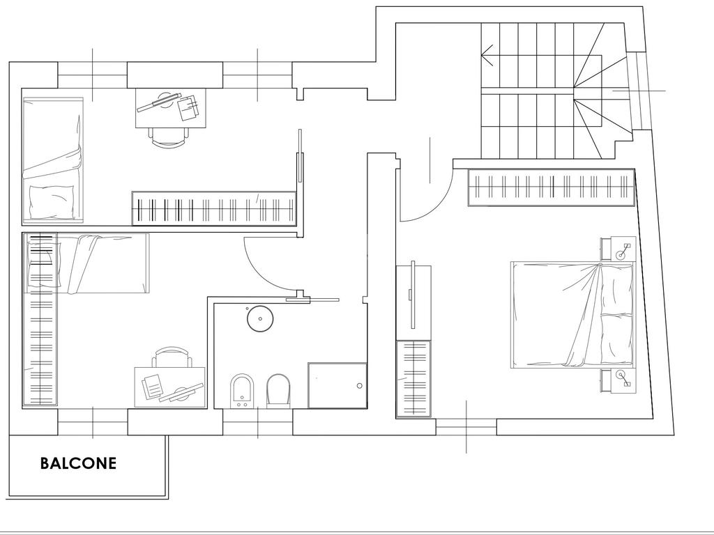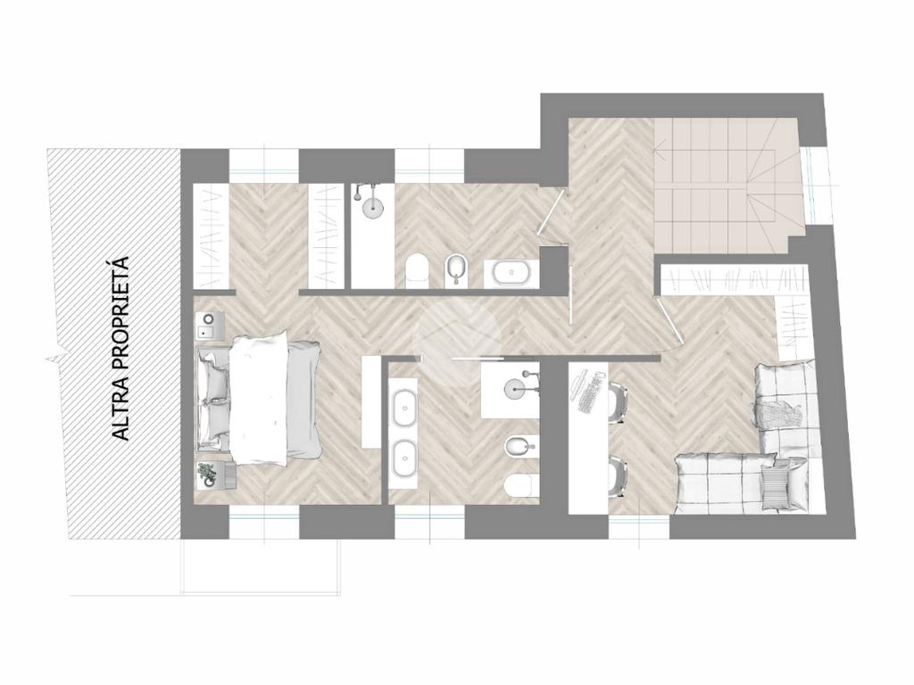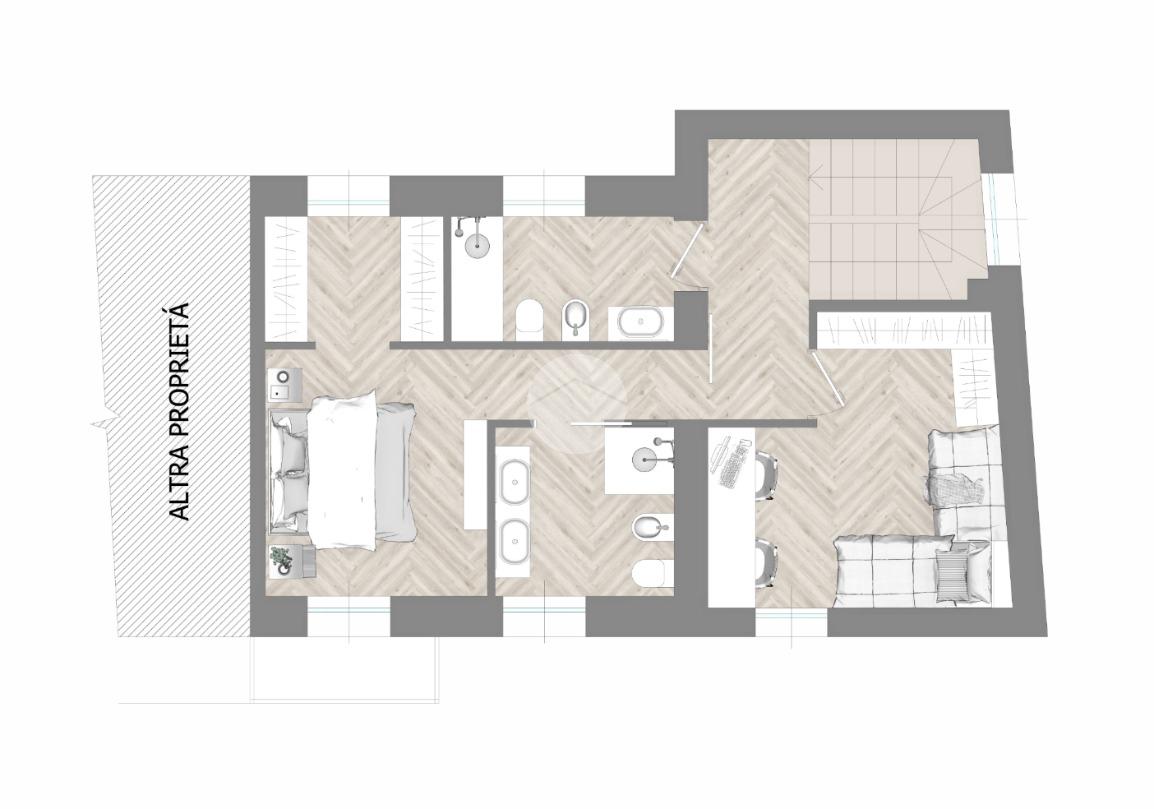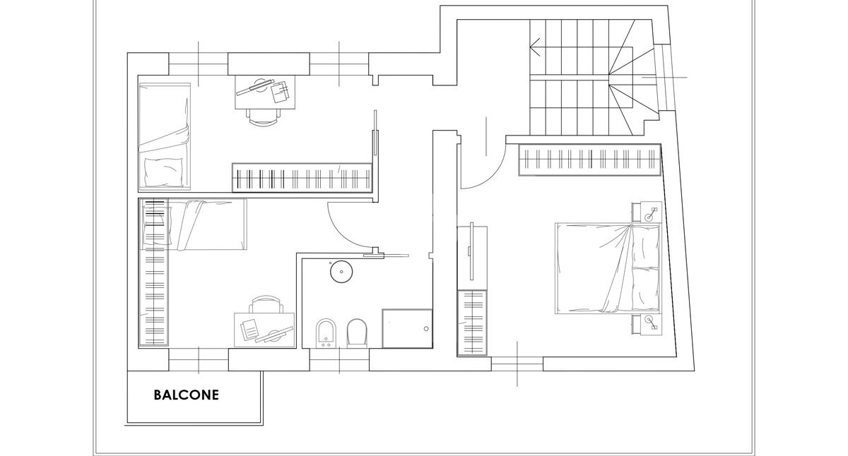 Tramite scala interna si accede al piano primo e si giunge nella zona notte. C’è la possibilità di suddividere i locali in diverse varianti. Esempio due camere grandi, di cui una con cabina armadio e doppio servizio oppure una camera da letto, due camerette e doppio servizio.