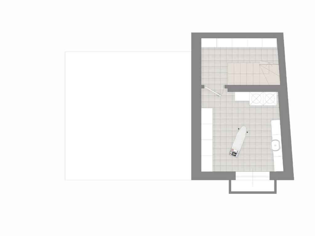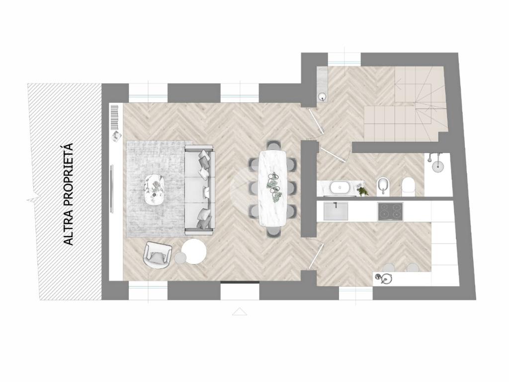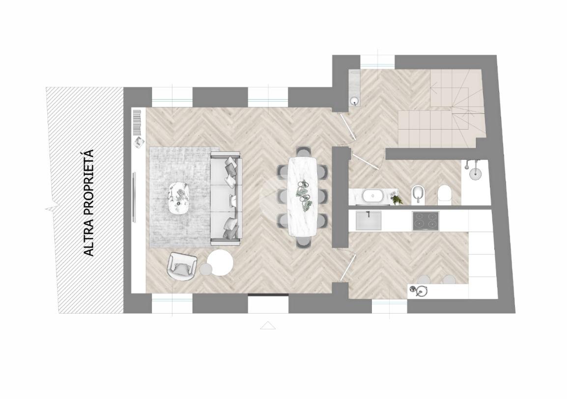 L’ingresso è nella zona giorno suddivisa in soggiorno, zona pranzo e cucina abitabile. Completa il livello un bagno.